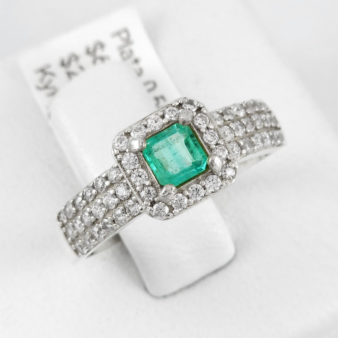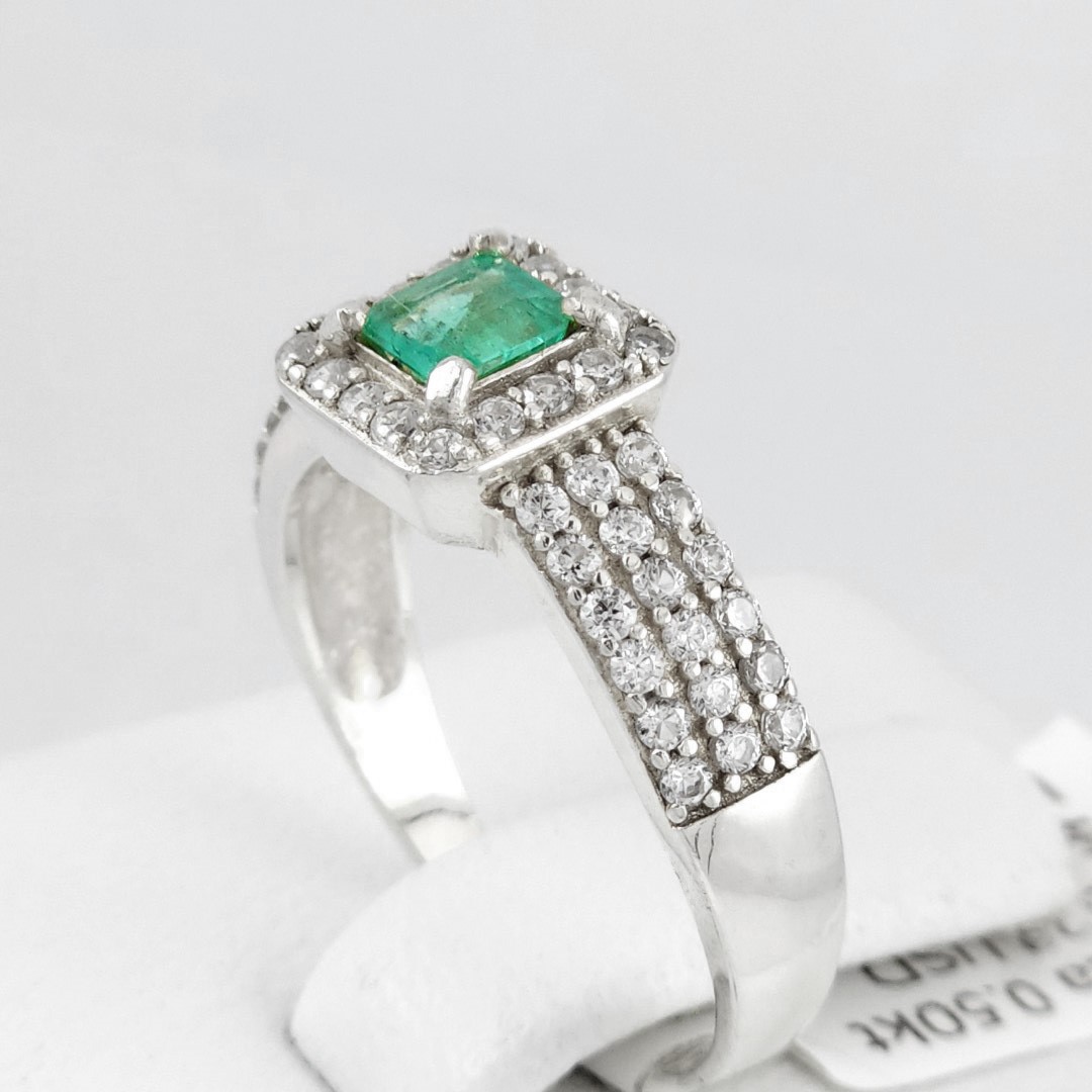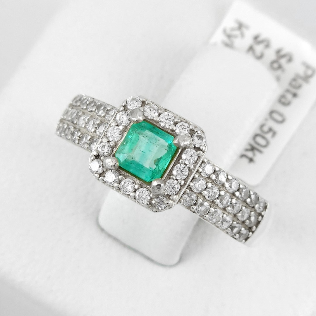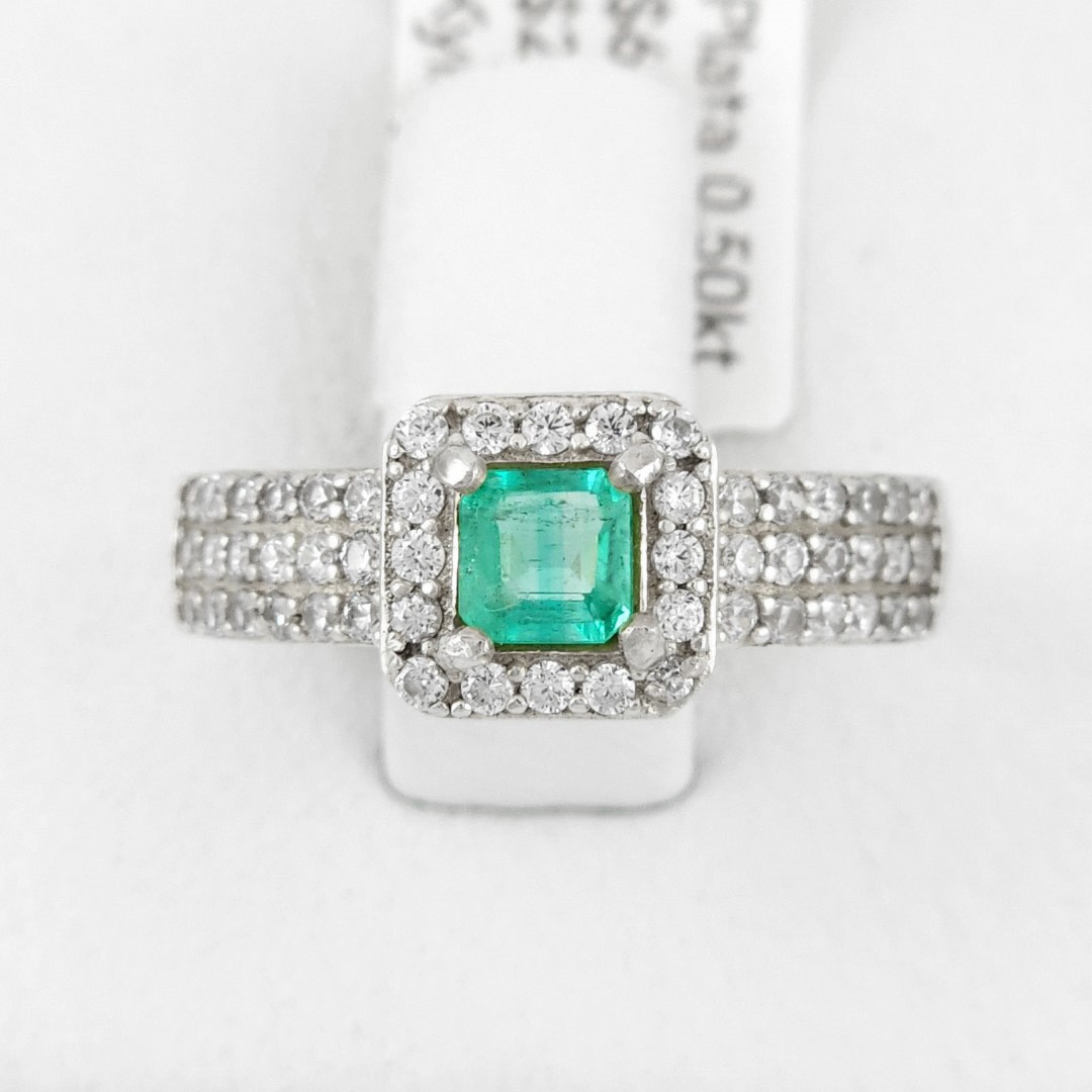 Anillo de plata sólida con esmeralda natural Colombiana y circones. Peso total de la(s) esmeralda(s) 0.50kt